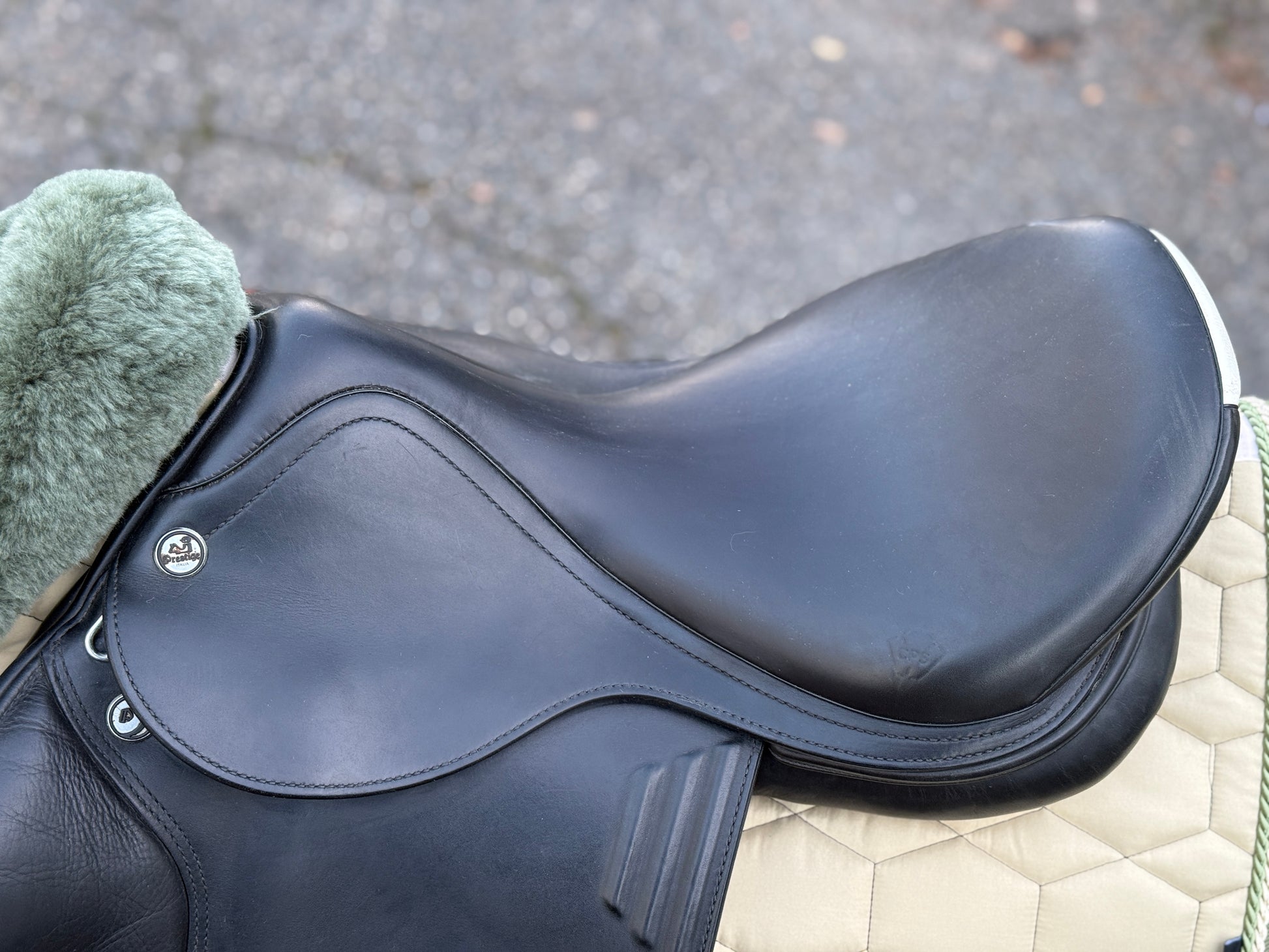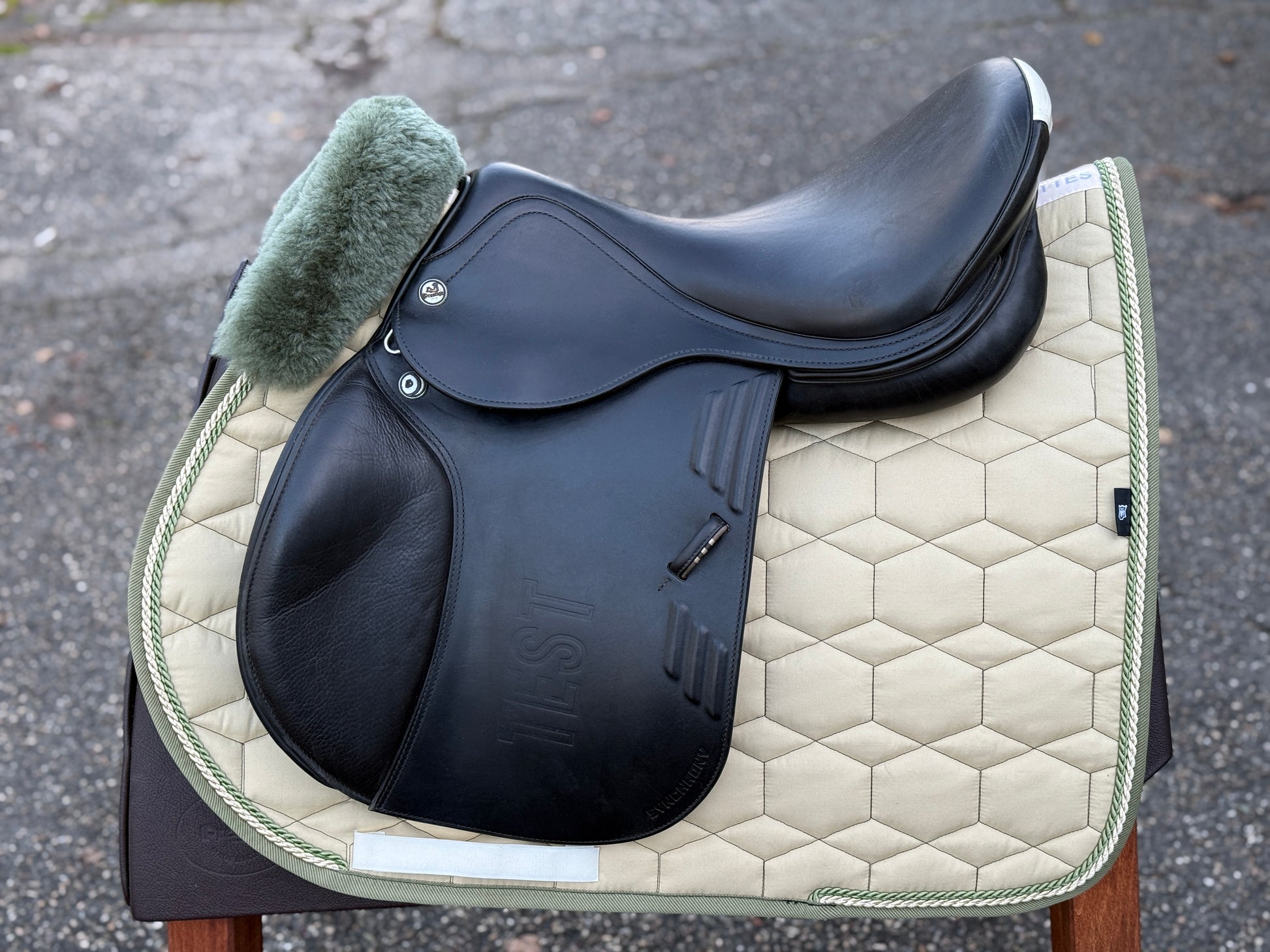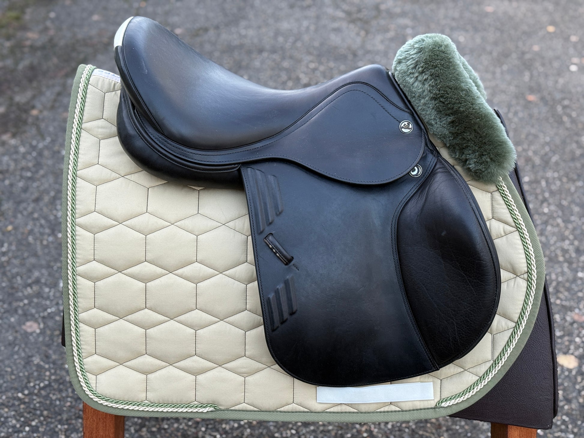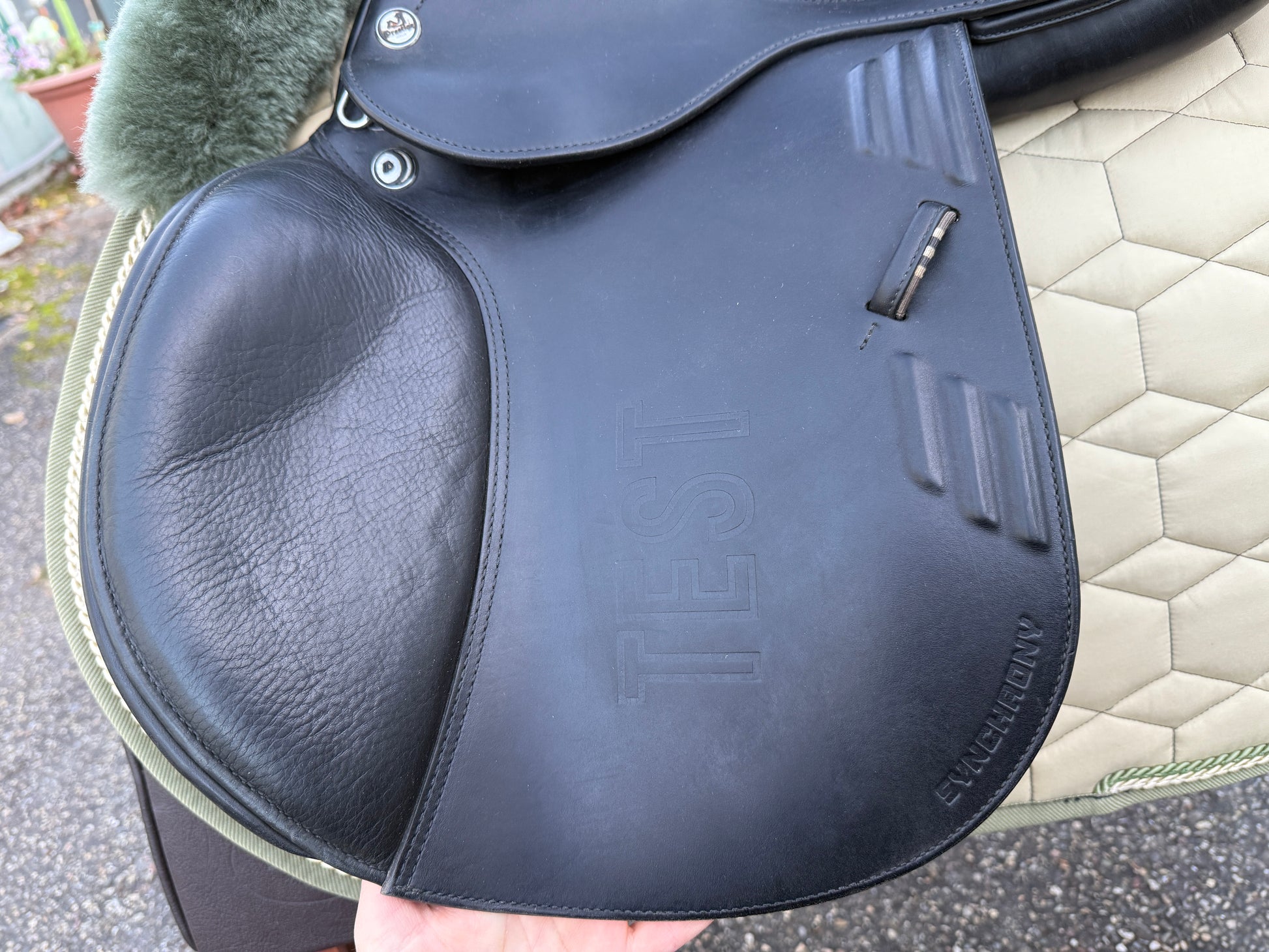 Der Prestige Synchrony CPS ist eine wahre Innovation im Springsattelbereich. Er bietet durch seine weichen, flächigen Kissen eine breite, aber kurze Auflage. Durch die leicht zurückgesetzten Ortspitzen bietet er auch an der Schulter extrem viel Platz. Für den Reiter ist er extrem komfortabel - durch das weiche anschmiegsame Leder und die super softe CPS Sitzschale. Der Sattel hat einen TEST Aufdruck auf dem linken Blatt.