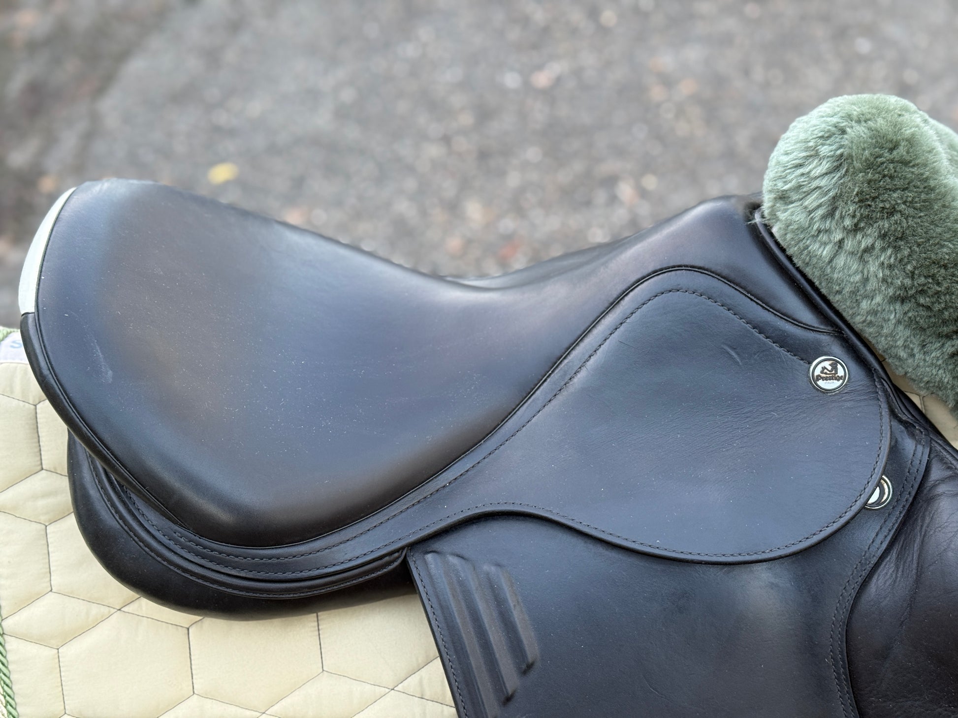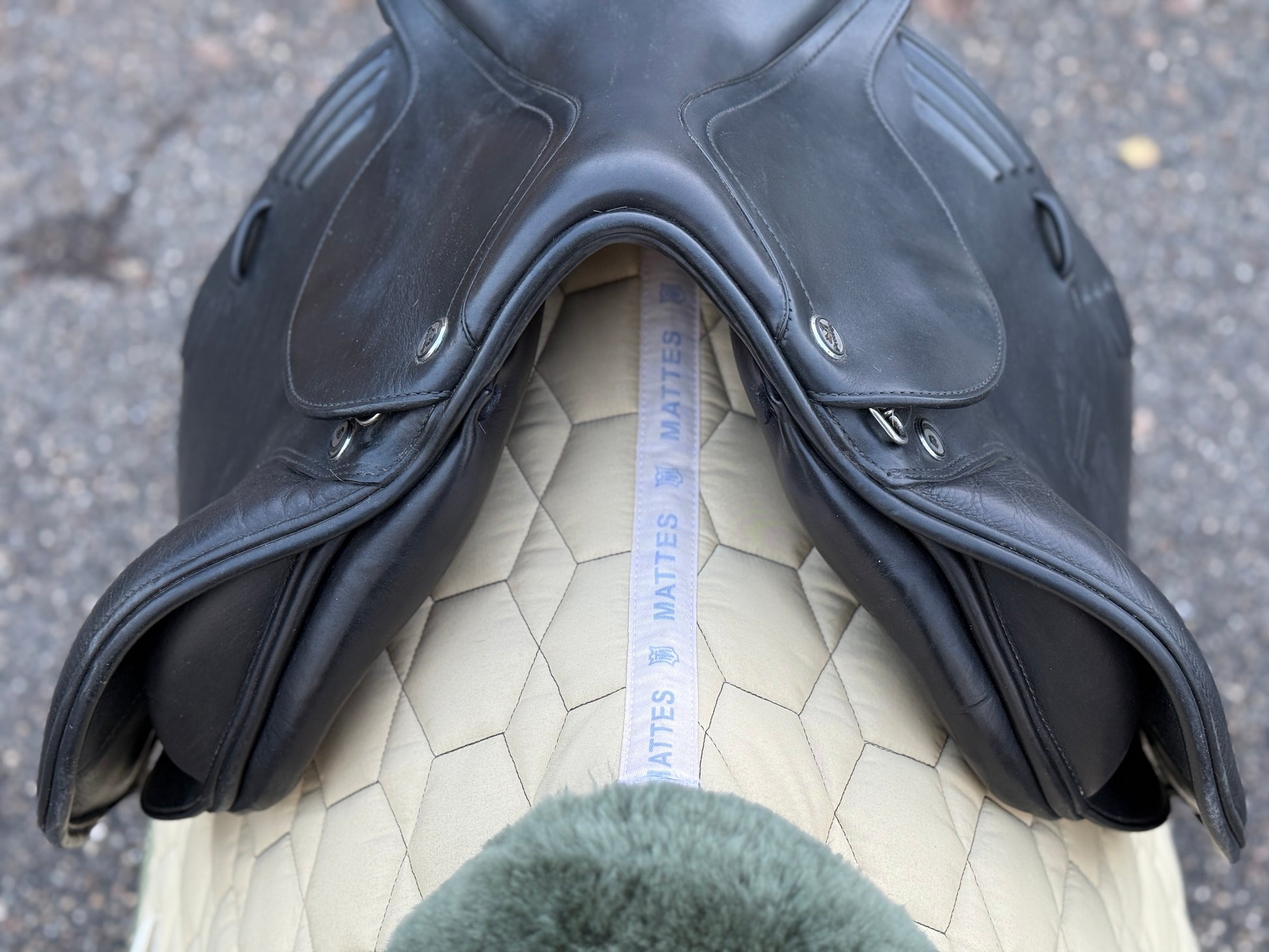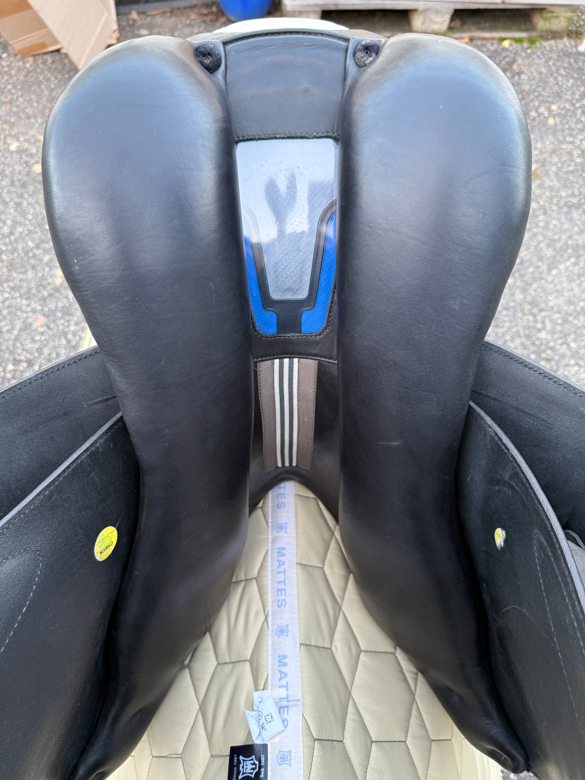 Der Prestige Synchrony CPS ist eine wahre Innovation im Springsattelbereich. Er bietet durch seine weichen, flächigen Kissen eine breite, aber kurze Auflage. Durch die leicht zurückgesetzten Ortspitzen bietet er auch an der Schulter extrem viel Platz. Für den Reiter ist er extrem komfortabel - durch das weiche anschmiegsame Leder und die super softe CPS Sitzschale. Der Sattel hat einen TEST Aufdruck auf dem linken Blatt.
