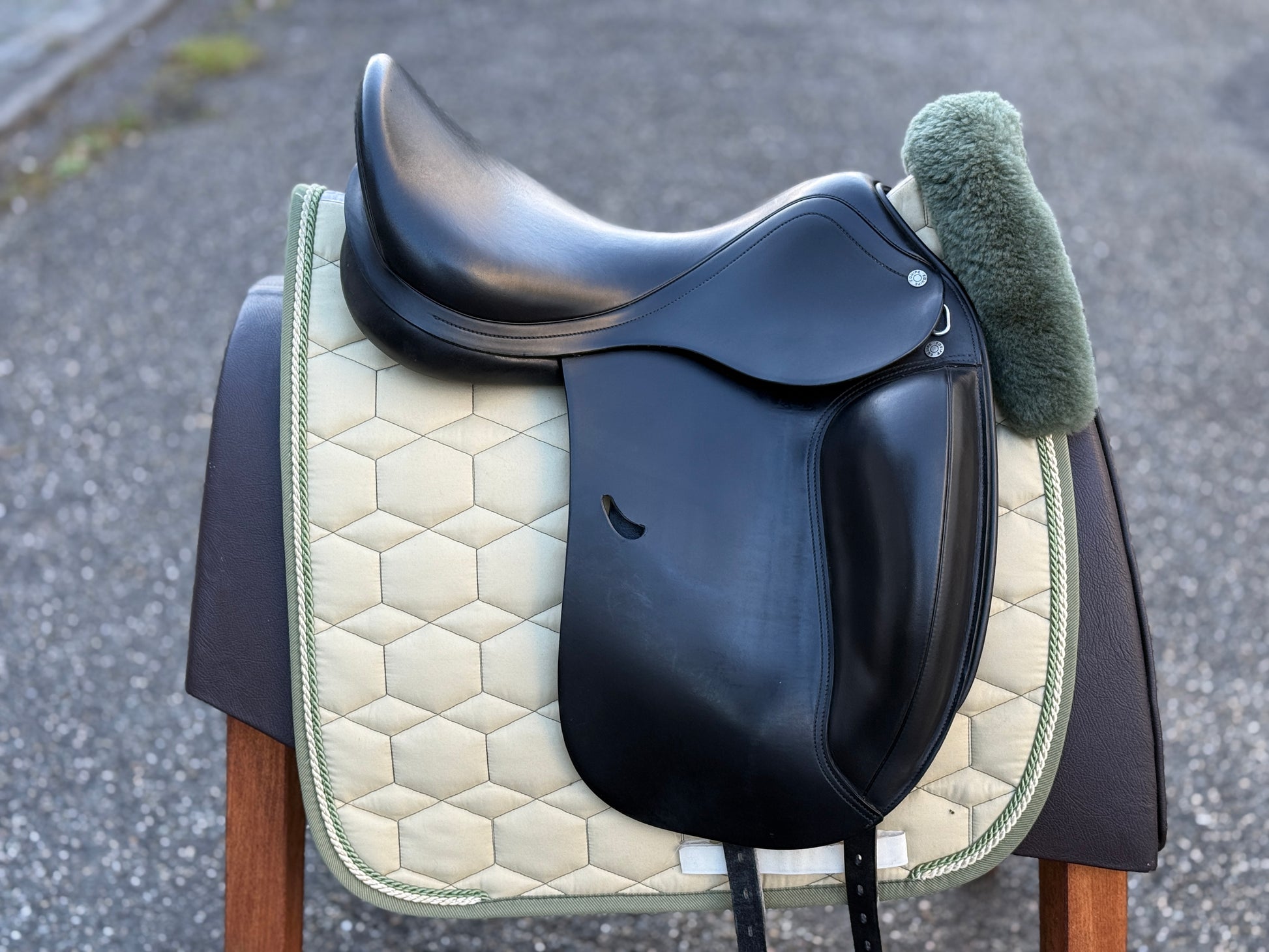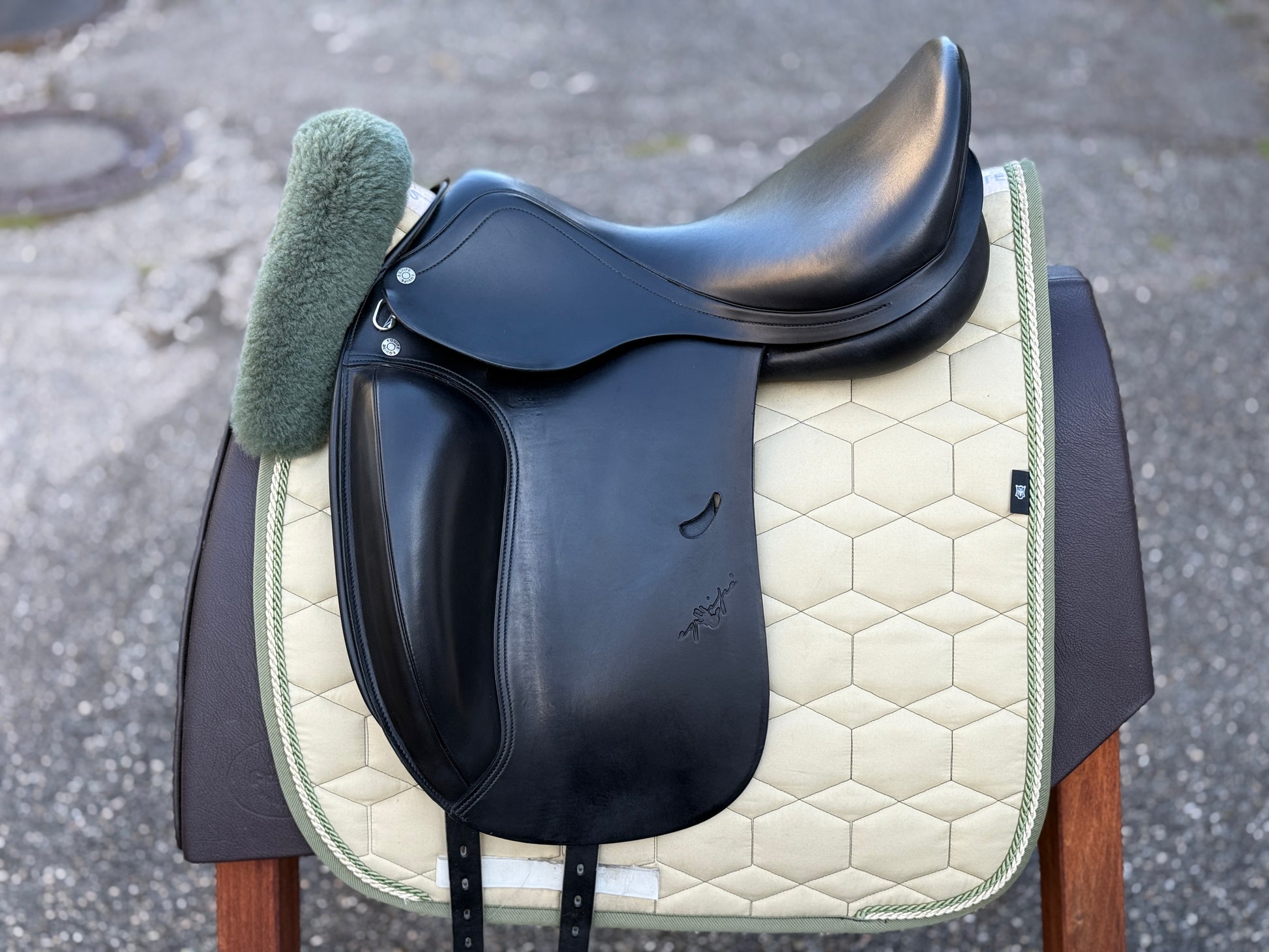 Dressursattel aus dem Hause Equipe mit tiefem Sitz und aufgesetzter Pausche. Viel dichter kann man nicht am Pferd sitzen! Die Passform eignet sich perfekt für ein schmales, kurzes Pferd. Der Sattel ist Baujahr 2014 - aber neuwertig.